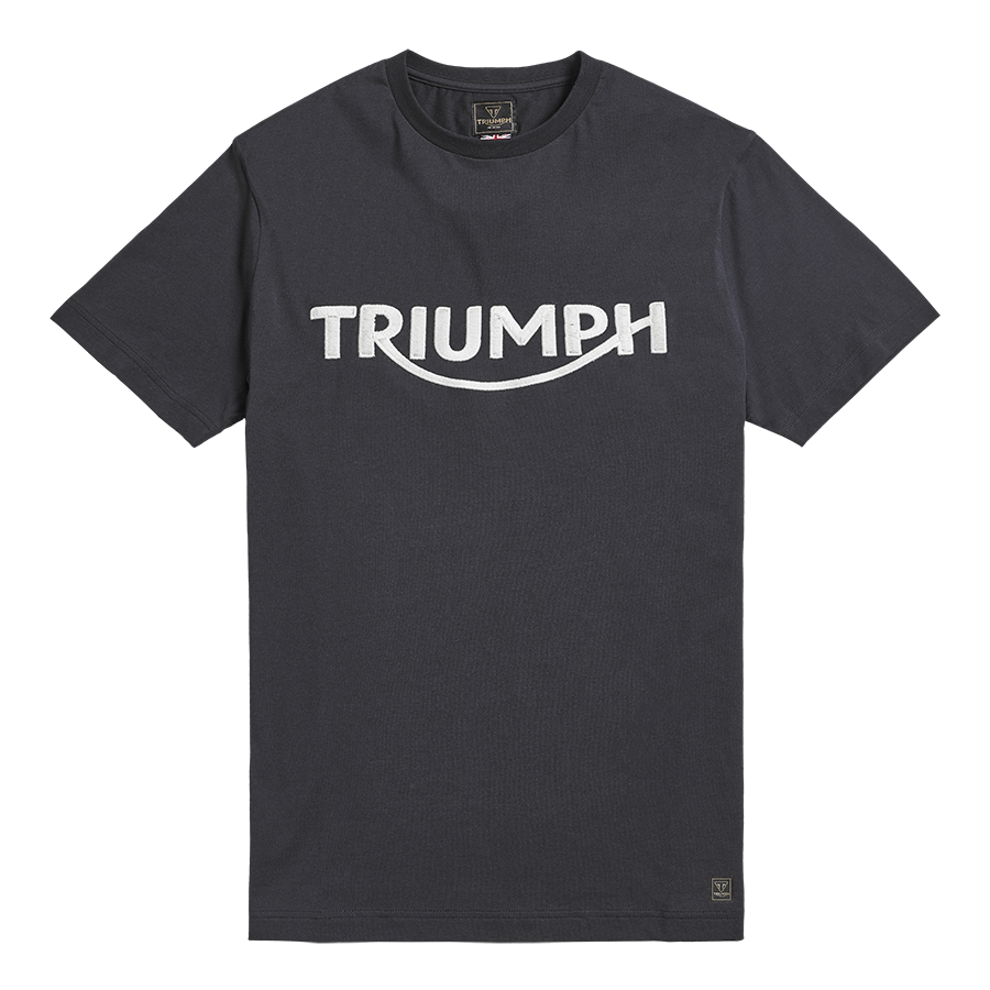 Classic 100% cotton 160g weight Jet Black tee featuring high quality embroidered Triumph logo in Bone and new signature Triumph-branded woven badge towards the lower hem.