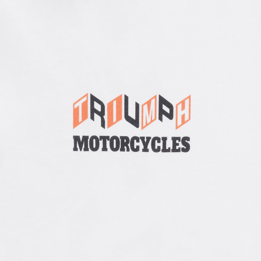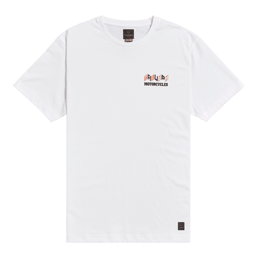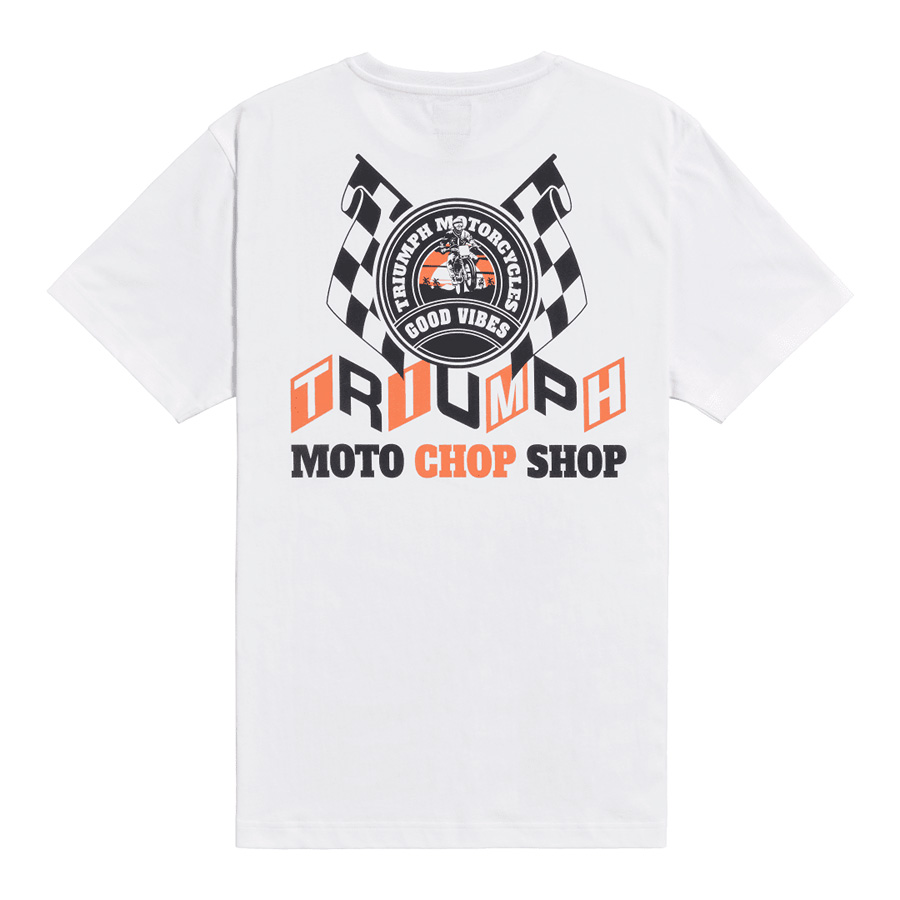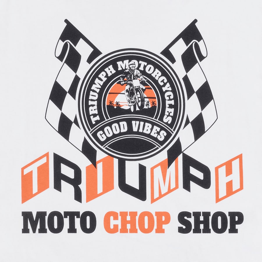 A classic fit tee with small stylised "Triumph Motorcycles" text on the front and "Good Vibes" back graphic.