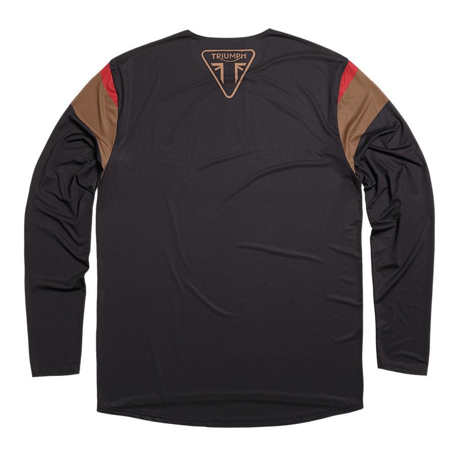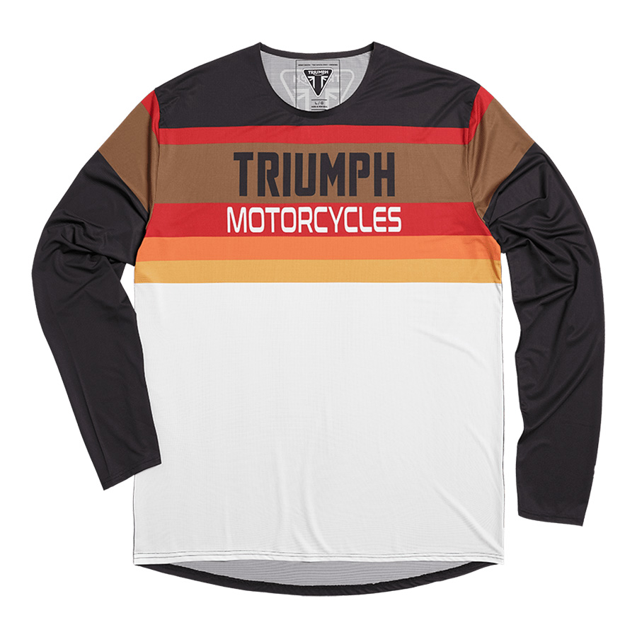 Constructed from ultra-light advanced polyester stretch mesh and featuring a shaped back panel for a secure and comfortable fit. Our range of Adventure Jerseys are available in an array of striking designs -including retro stripes, scenic graphic prints, all-over printed designs, and eyecatching gradients. Each jersey features bold branding, with stylised Triumph Motorcycles lettering or official logos at the chest, sleeve, and upper back. For off-road riding, the Adventure Jerseys can be combined with the Triumph ARMOURED Base Layer to add D3O® EN 1621 Impact Protectors.