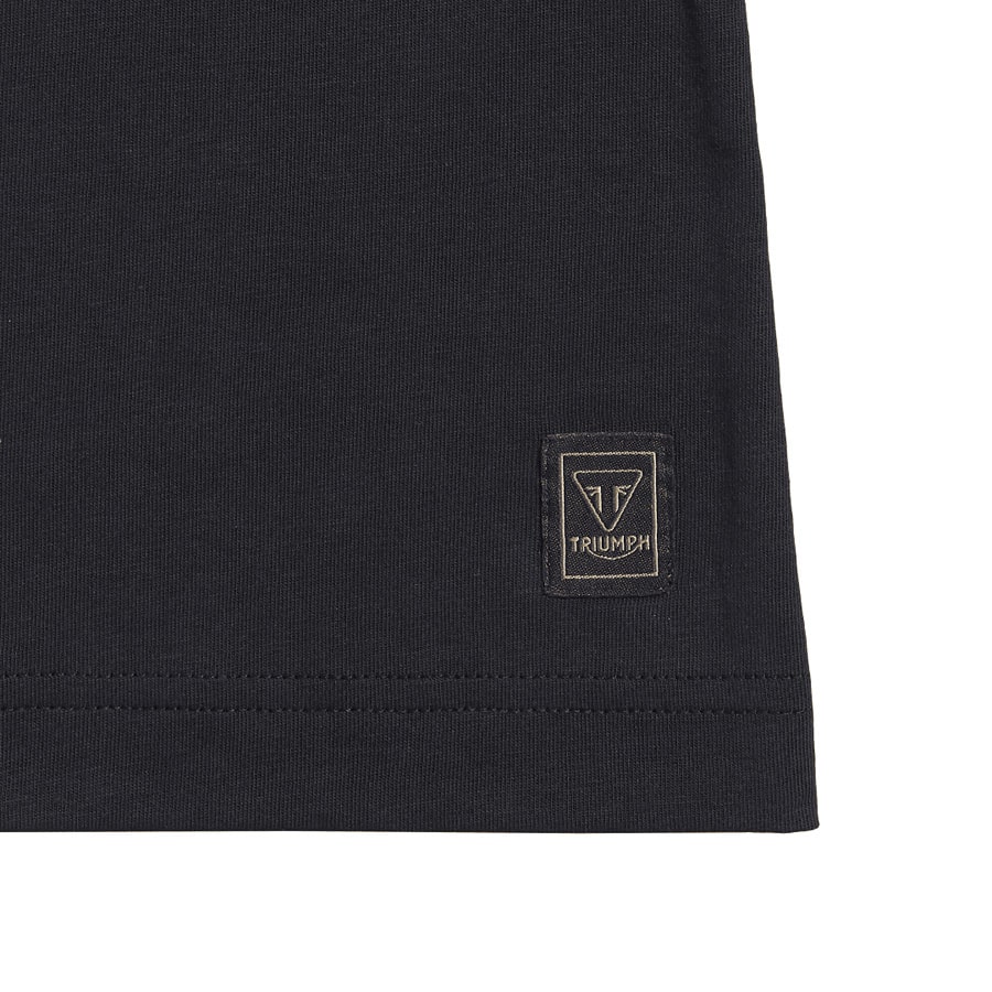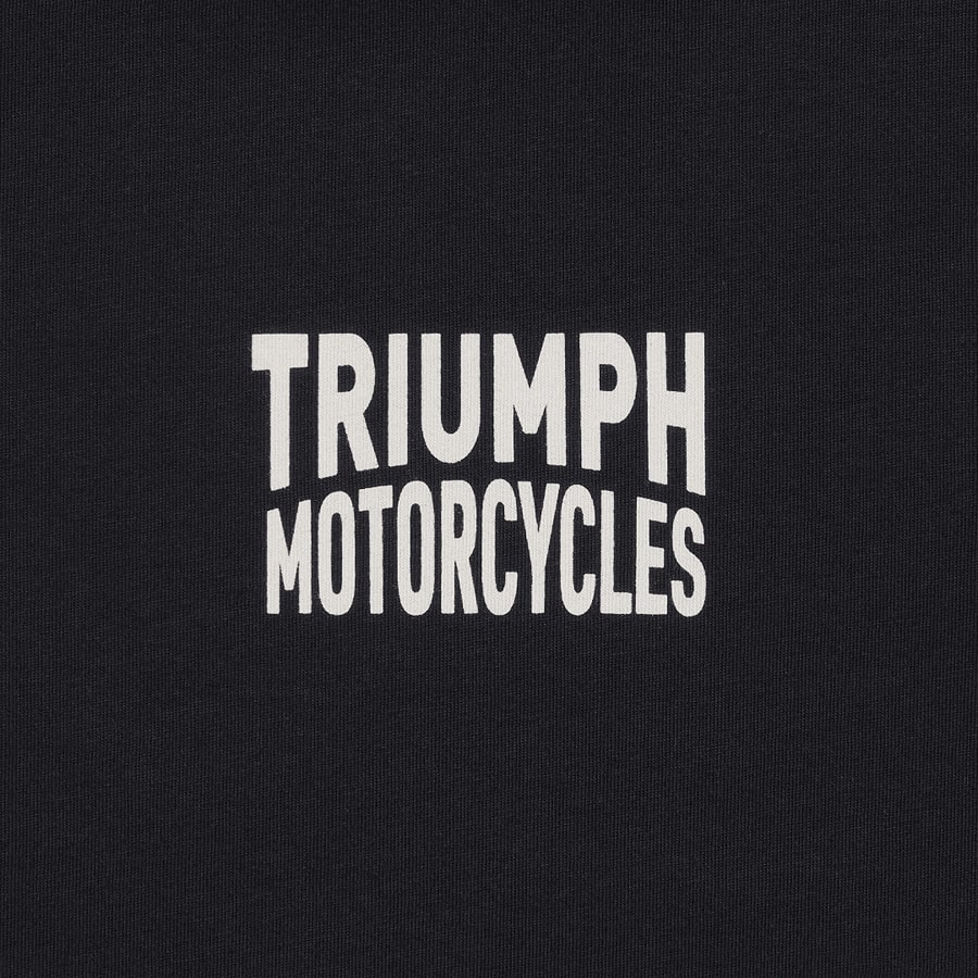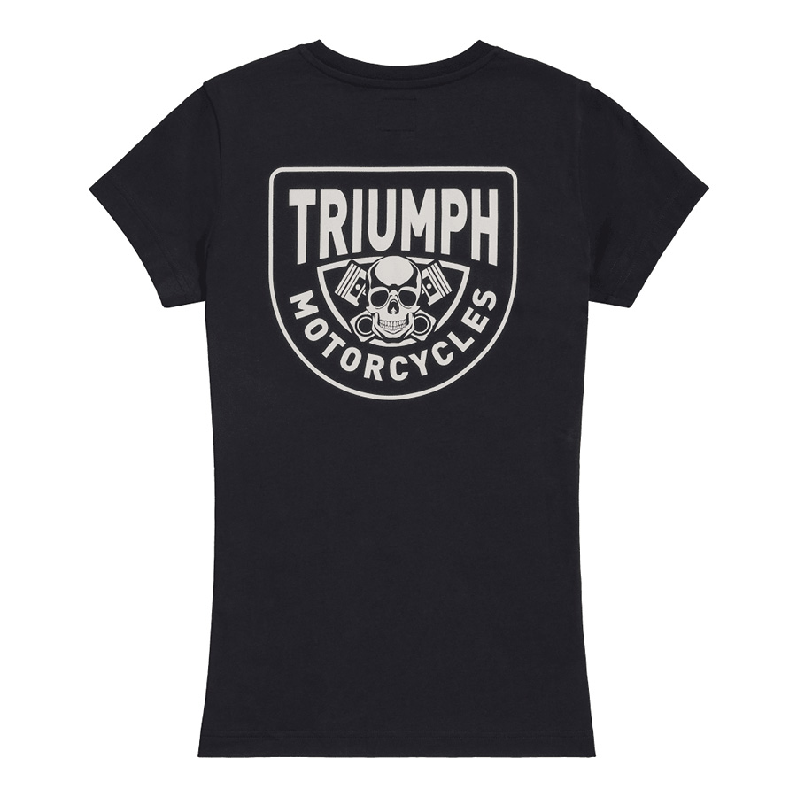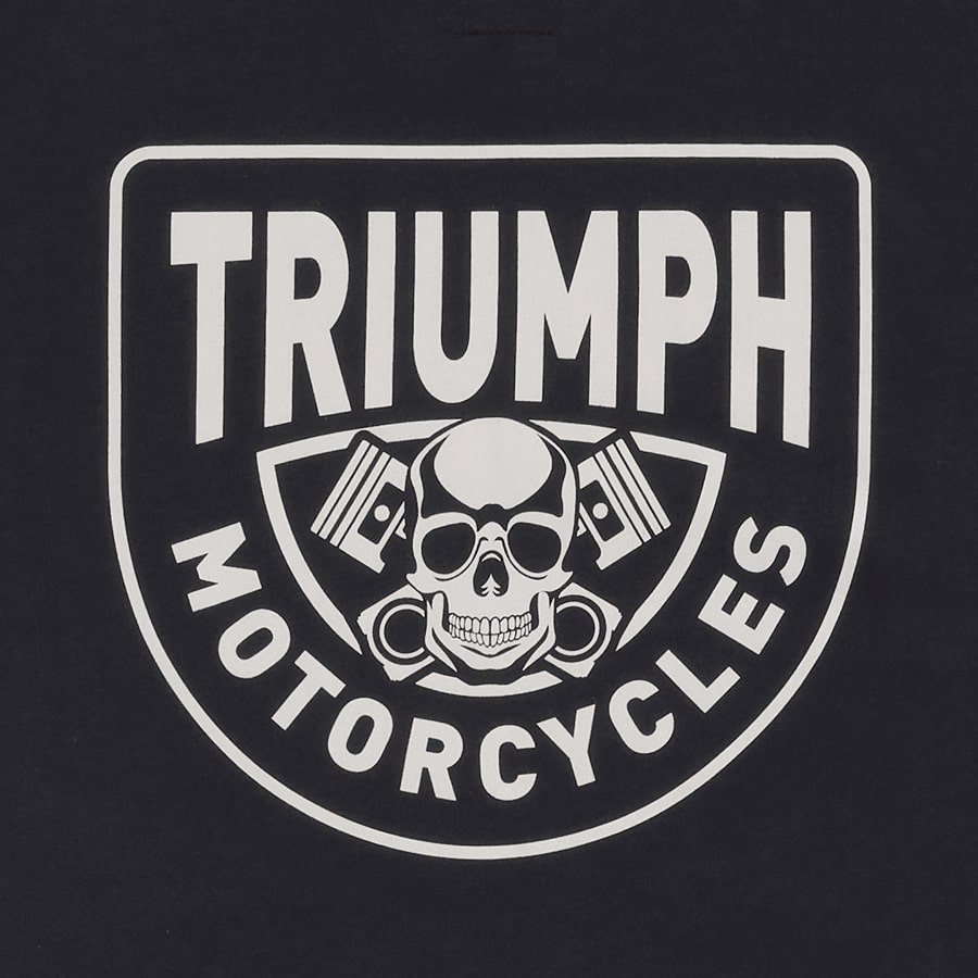 A classic fit tee with small stylised "Triumph Motorcycles" text on the front and "Piston Rich Skull" back graphic.