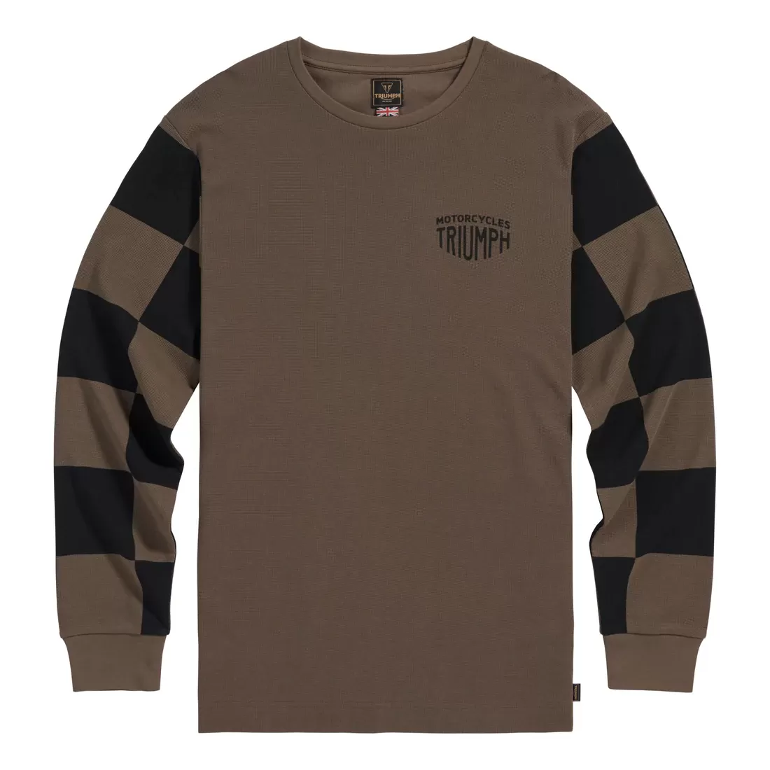 Classic fit tee featuring our Triumph Workshop Arched Graphic and bold checkerboard sleeves.